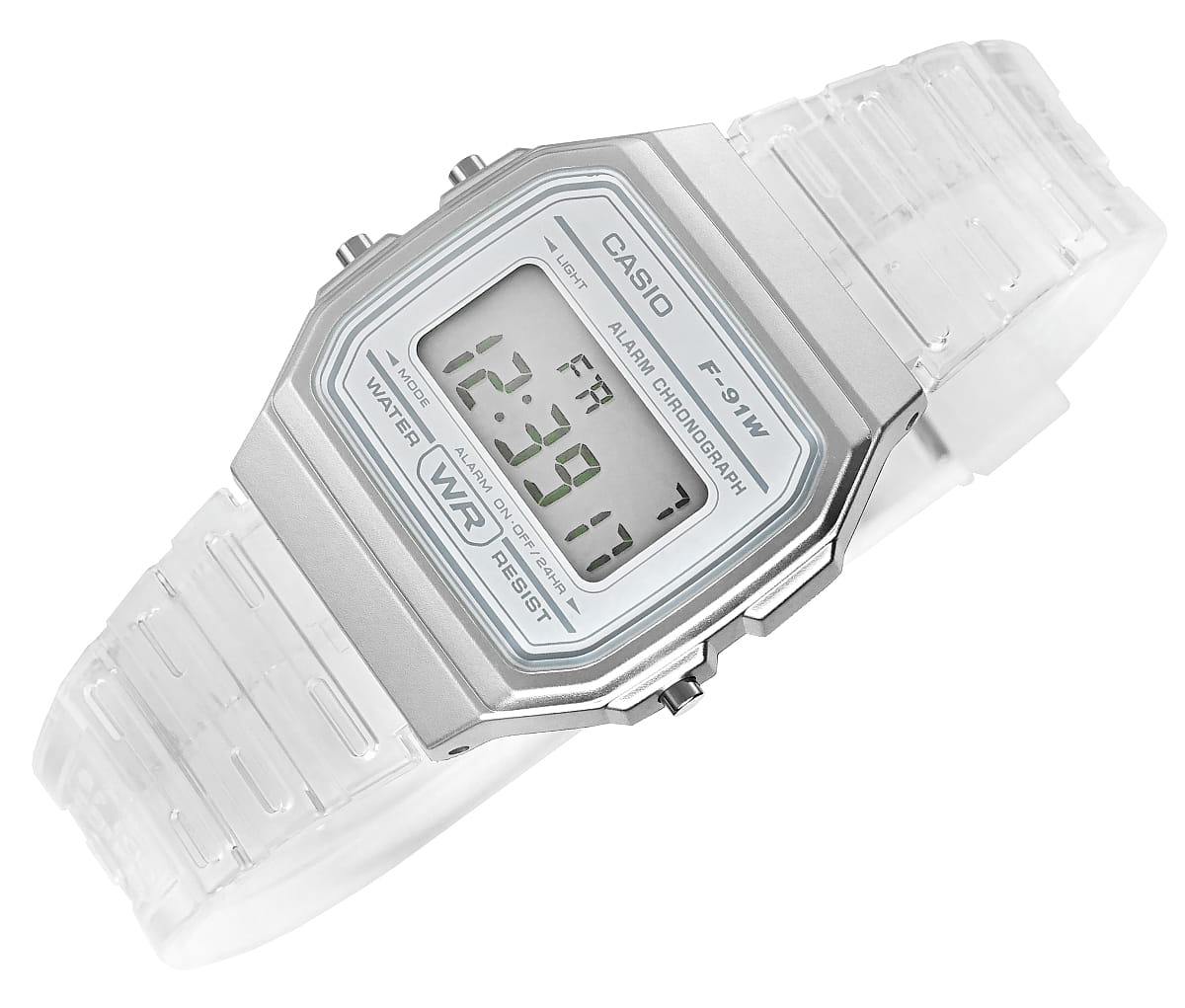- Tarcza: Kwarcowa. Alarm dzienny przypomina o wydarzeniach, które powtarzają się każdego dnia, emitując sygnał dźwiękowy; raz ustawiony zegarek zawsze wyświetla poprawną datę (pamięta o krótszych miesiącach); dokładność pomiaru do 1/100 sekundy, zakres pomiaru do 1 h; wbudowane podświetlenie z boku tarczy zegarka; można ustawić wyświetlanie czasu w formacie 12- lub 24-godzinnym. W trybie 12-godzinnym na wyświetlaczu w drugiej połowie doby, tzn. od godziny 12 do 23:59, obok godziny pojawia się literka, stoper, datownik