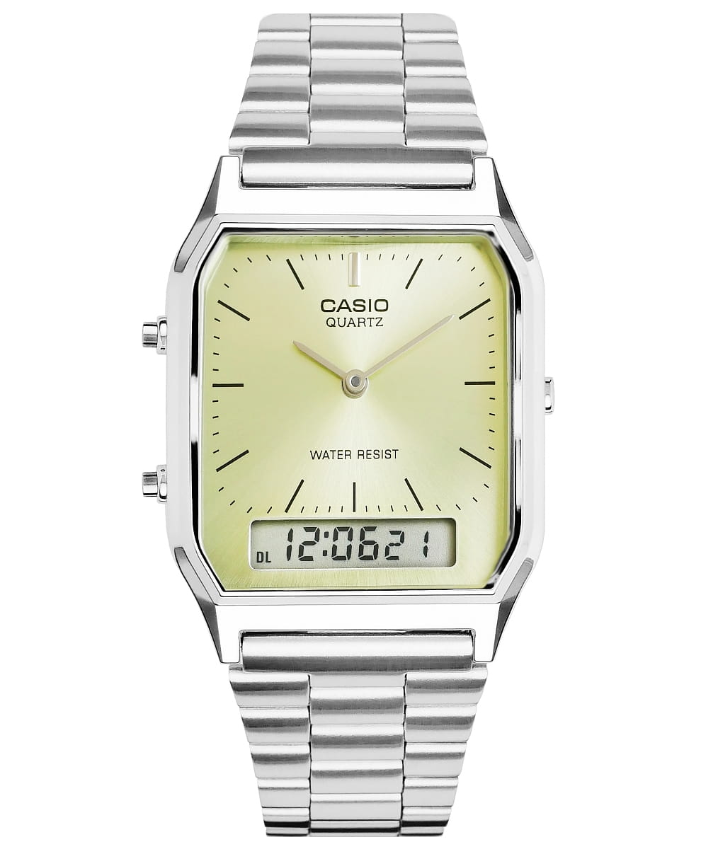 Casio AQ-230 to zegarek, ktĂłry łączy prestiĹĽ, funkcjonalność i ponadczasowÄ… estetykÄ™. Idealny wybĂłr dla tych, ktĂłrzy ceniÄ… styl vintage, ale nie chcÄ… rezygnować z nowoczesnych rozwiÄ…zaĹ„. Casio AQ-230 to nie tylko piÄ™kny design, ale rĂłwnieĹĽ doskonaĹ‚a precyzja dziaĹ‚ania. PodwĂłjny wyĹ›wietlacz analogowo-cyfrowy pozwala na kontrolowanie czasu w dwĂłch strefach jednoczeĹ›nie, a dodatkowe funkcje, takie jak alarm, stoper i kalendarz automatyczny, zwiÄ™kszajÄ… jego praktyczność.Â