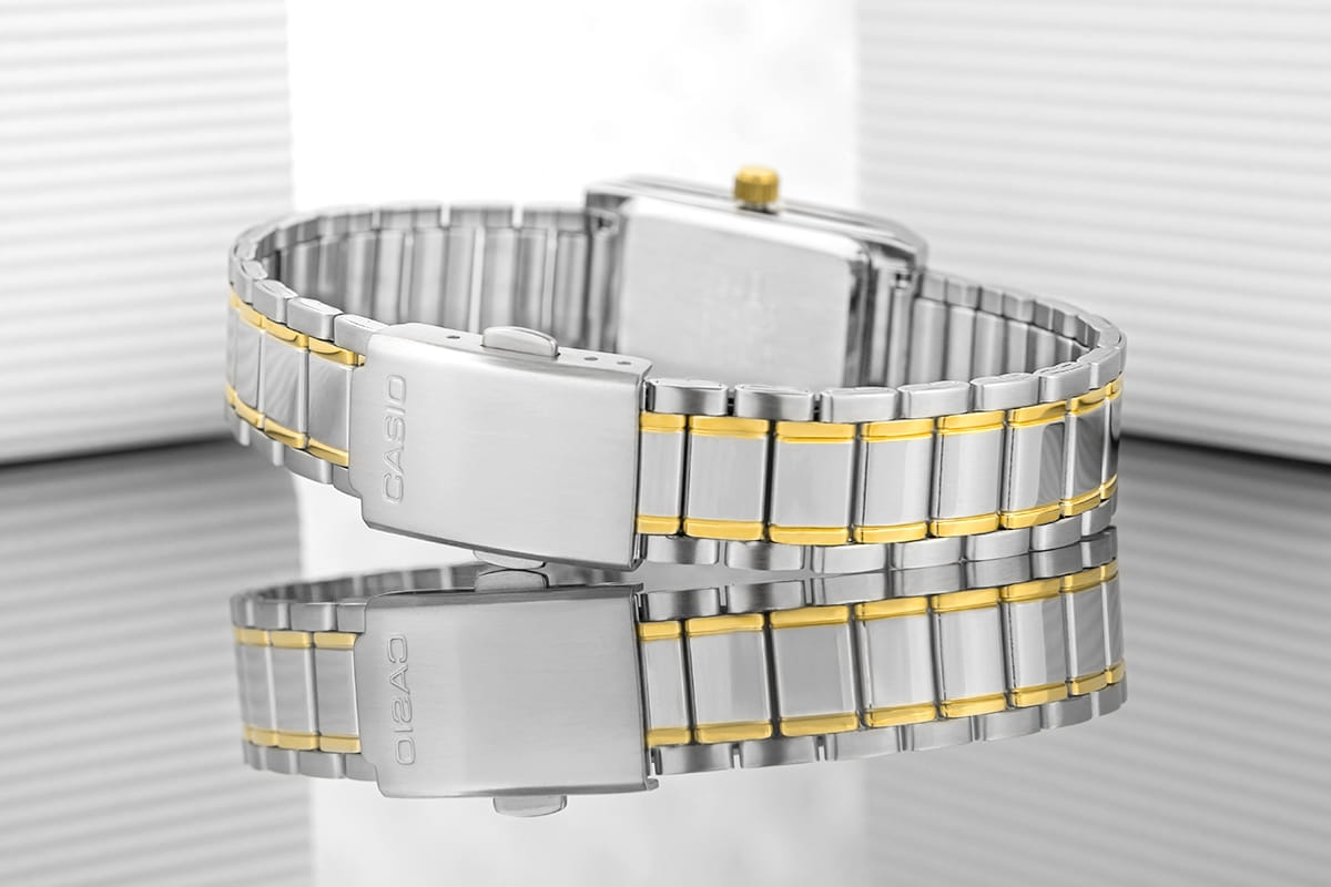 Wykonana z wysokiej jakości stali nierdzewnej, o podwójnym rodzaju wykończenia: matowym środku oraz szczotkowanych brzegach nadaje zegarkowi unikalny wygląd. Stal nierdzewna jest materiałem odpornym na uszkodzenia mechaniczne, co sprawia, że bransoleta dobrze znosi codzienne użytkowanie i zachowuje swój estetyczny wygląd przez długi czas. Zegarek jest wyposażony w specjalne zapięcie, które pozwala na regulację długości bransolety bez potrzeby usuwania ogniw. Bransoleta posiada solidne, zatrzaskowe zapięcie, które zapobiega przypadkowemu rozpięciu zegarka, co jest szczególnie ważne w sytuacjach aktywnych lub intensywniejszych ruchach ręki.