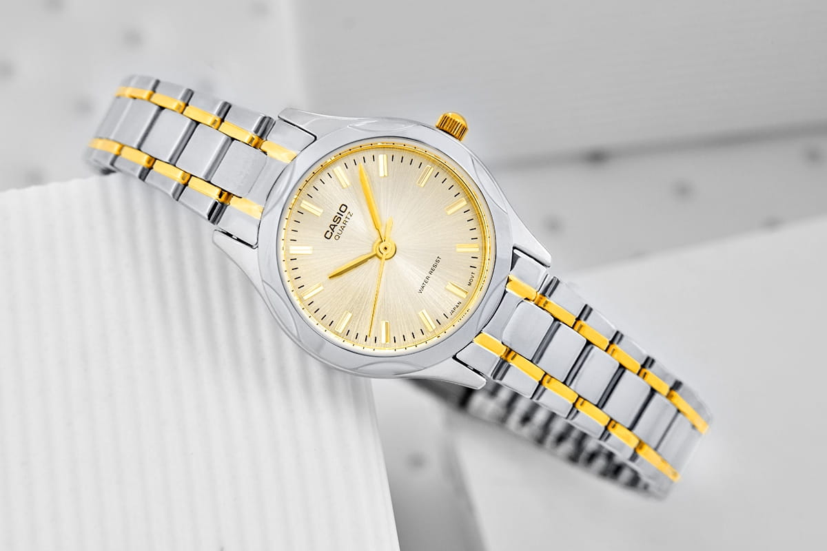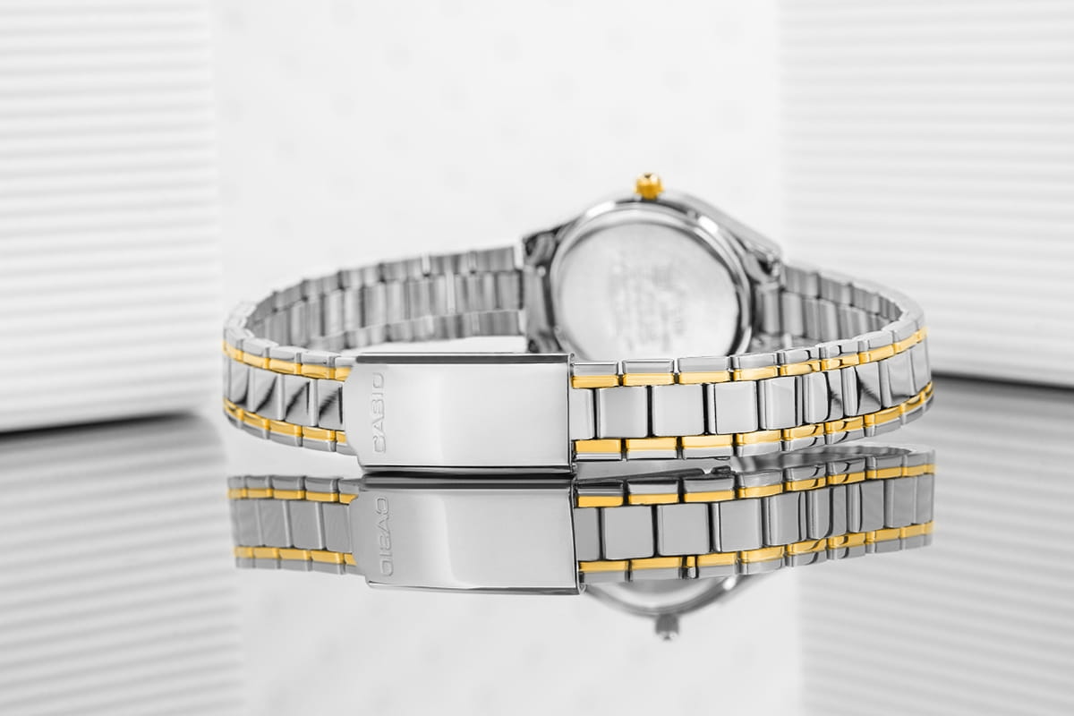 Bransoleta wykonana jest z lśniącej stali nierdzewnej w srebrnym odcieniu ze złotymi akcentami, które subtelnie podkreślają luksusowy wygląd zegarka. Kontrast pomiędzy chłodnym blaskiem srebra a ciepłym połyskiem złota sprawia, że model ten prezentuje się niezwykle szykownie i ponadczasowo. To doskonałe rozwiązanie dla kobiet, które cenią sobie uniwersalność biżuteryjnych dodatków, a jednocześnie chcą dodać swojemu wyglądowi odrobiny luksusu. Całość dopełnia subtelne logo CASIO na zapięciu bransolety.