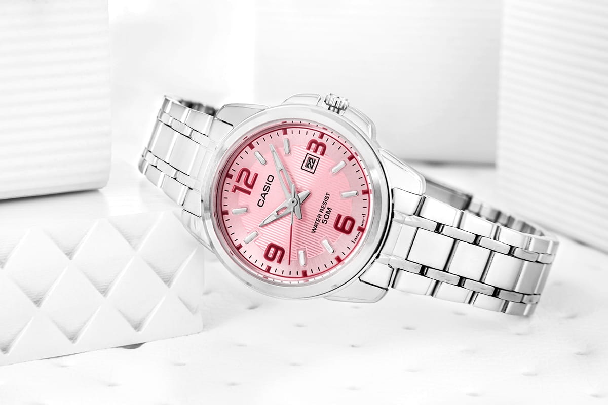Model CASIO  LTP-1314D-5AVDF to zegarek stworzony z myślą o kobietach, które cenią sobie subtelny design połączony z codzienną wygodą i funkcjonalnością. Tarcza tego zegarka to prawdziwa cukierkowa przyjemność – subtelna, różowa i pełna kobiecego uroku. Jej lekki połysk i delikatny wzór dodają całości wyjątkowej słodyczy, która przyciąga spojrzenia. To idealny dodatek dla kobiet, które lubią połączenie klasyki z nutą romantycznej fantazji. Wodoodporność do 50 metrów, wyraźne oznaczenia godzin oraz praktyczny datownik czynią ten model niezawodnym towarzyszem na co dzień – niezależnie od okazji.