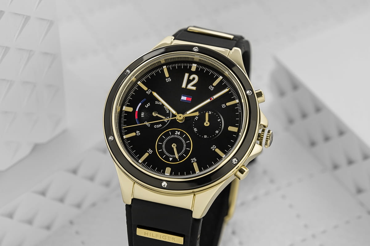 Tommy Hilfiger Eve to zegarek, ktĂłry oplata nadgarstek zmysĹ‚owÄ… harmoniÄ… zĹ‚ota i czerni, tworzÄ…c wyrafinowanÄ… opowieść o kobiecej elegancji.Â