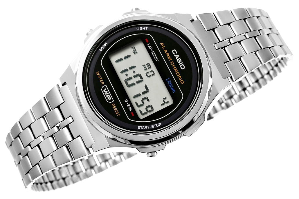 Casio A171WE-1ADF to klasyczny zegarek cyfrowy, który łączy w sobie retro design z nowoczesną funkcjonalnością. Jego stylowa, okrągła koperta w srebrnym kolorze oraz stalowa bransoleta sprawiają, że pasuje zarówno do codziennych stylizacji, jak i bardziej eleganckich zestawień. Cyfrowy wyświetlacz o wysokiej czytelności pokazuje godzinę, minutę, sekundę, dzień tygodnia oraz datę, a dodatkowe funkcje, takie jak stoper, alarm i podświetlenie, czynią ten model wyjątkowo praktycznym.