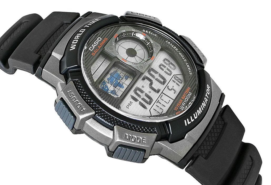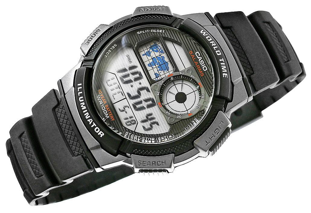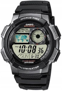 Model CASIO z Multi Time, światowym czasem, stoperem, alarmem x 5 i minutnikiem - a to wszystko 10 lat na jednej baterii. Casio AE-1000W to zegarek, który nadąża za Tobą - tarcza inspirowana kokpitem samolotu nadaje mu surowy, techniczny charakter, który podkreśla męski styl i dynamiczny tryb życia. Dzięki mapie świata i funkcji World Time możesz jednym rzutem oka sprawdzić czas w różnych strefach, co sprawia, że to idealny wybór dla podróżników i profesjonalistów pracujących na międzynarodową skalę. Wyświetlacz LC Analog sprawia, że zawsze masz pod ręką godzinę swojego miasta domowego, a wodoodporność do 100 metrów pozwala na swobodne użytkowanie zegarka w trudniejszych warunkach. To zegarek dla mężczyzn, którzy oczekują więcej – precyzji, trwałości i stylu.
