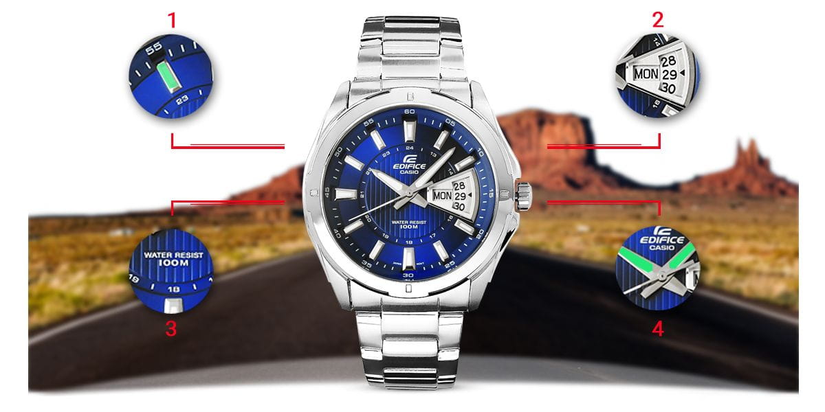 Wybierając ten model CASIO EDIFICE zyskujesz topowy zegarek męski, który spełnia najwyższe oczekiwania. Nowoczesny układ z metalizowaną granatową tarczą uzupełnioną o datownik podkreśla dynamiczny charakter zegarka, łącząc funkcjonalność z unikalnym designem. Wodoszczelność 10 BAR pozwala na swobodę w wodzie, a fluorescencyjne podświetlenie gwarantuje widoczność nawet po zmroku. Logo EDIFICE wytłoczone na koronce, deklu i zapięciu.