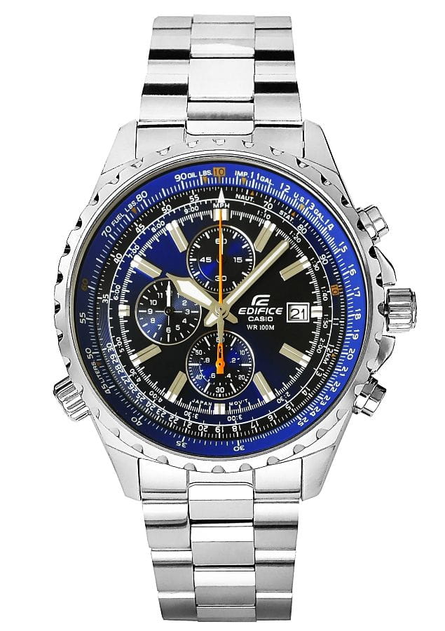 - TARCZA: Analogowa z chronografami, suwakiem logarytmicznym, wskaĹşnikiem daty dni miesiÄ…ca