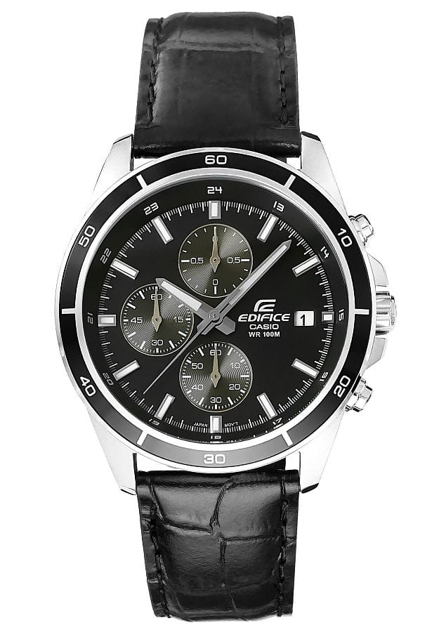 Średniej wielkości, standardowy chronograf EDIFICE. Uniwersalny charakter zegarka i czarny skórzany pasek sprawia, iż całość pasuje zarówno do stylu casual oraz sportowej elegancji. Wyposażony w funkcję daty dni miesiąca oraz chronografy: stoper 1/10 sekund, sekundnik, stoper minut. Dzięki wodoszczelności 10 BAR możesz śmiało zabrać go na basen, trening czy wodną przygodę. Fluorescencyjne podświetlenie sprawia, że nawet po zmroku masz pełną kontrolę nad czasem.