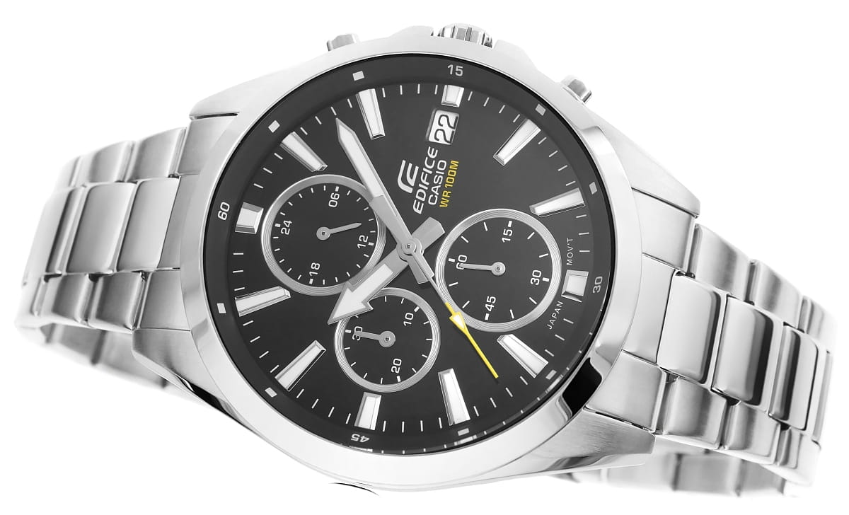 Znajdź idealną harmonię stylu i precyzji z klasycznym, średniej wielkości chronografem EDIFICE. Wyrafinowane połączenie dopracowanych detali i nowoczesnego designu wyróżnia się cienkim bezelem, który kontrastuje z szeroką tarczą, nadając zegarkowi wyrazisty, elegancki charakter. Wyposażony w funkcję daty dni miesiąca oraz chronografy: wskaźnik 24-godzinny, minuty stopera, sekundy stopera. Dzięki wodoszczelności 10 BAR możesz śmiało zabrać go na basen, trening czy wodną przygodę. Fluorescencyjne podświetlenie sprawia, że nawet po zmroku masz pełną kontrolę nad czasem.