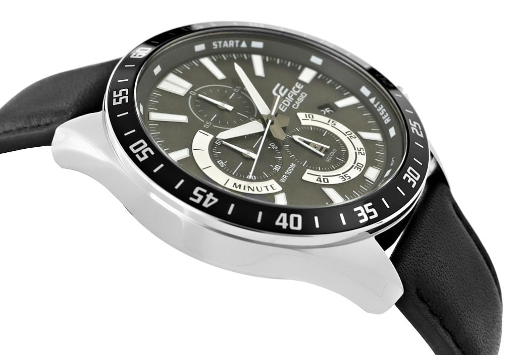 Postaw na wyrazistość z klasycznym chronografem EDIFICE w odważnym połączeniu precyzyjnych detali i imponującego, dużego designu (koperta o średnicy 55 mm). Model zainspirowany światem motorsportu, zachwyca efektownymi subtarczami, które podkreślają sportowy charakter, szybkość i inteligentny styl. Zegarek wyposażony w funkcję daty dni miesiąca oraz chronografy: stoper 1/10 sekundy, minuty stopera oraz sekundy stopera. Dzięki wodoszczelności 10 BAR możesz śmiało zabrać go na basen, trening czy wodną przygodę, a fluorescencyjne podświetlenie sprawia, że nawet po zmroku masz pełną kontrolę nad czasem.