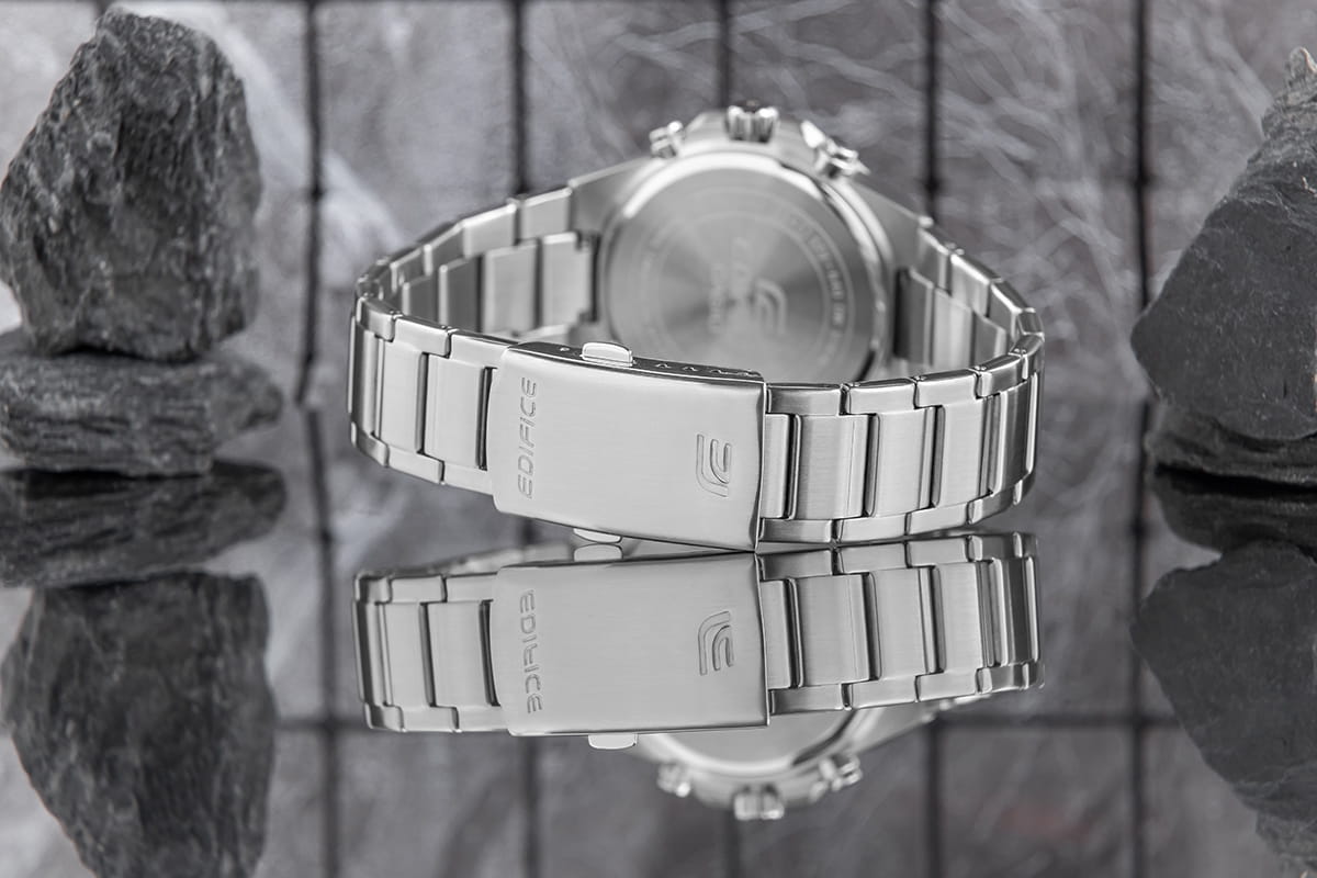 Komfortowa, stalowa bransoleta to znakomite uzupełnienie tego zegarka. Rodzaj bransolety jest gwarancją solidności i wygody podczas codziennego użytkowania. Komfort dopełnia odpowiednia jakość stali, która komfortowo dopasowuje się do męskiego nadgarstka. Zapięcie sygnowane jest logiem marki Edifice, co podnosi prestiż zegarka i zapewnia wyjątkowość na tle innych marek zegarków.