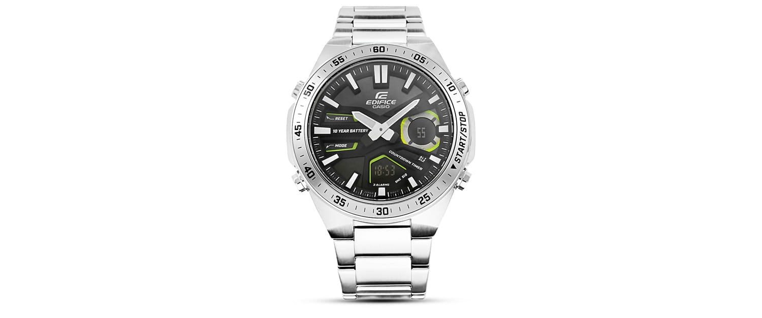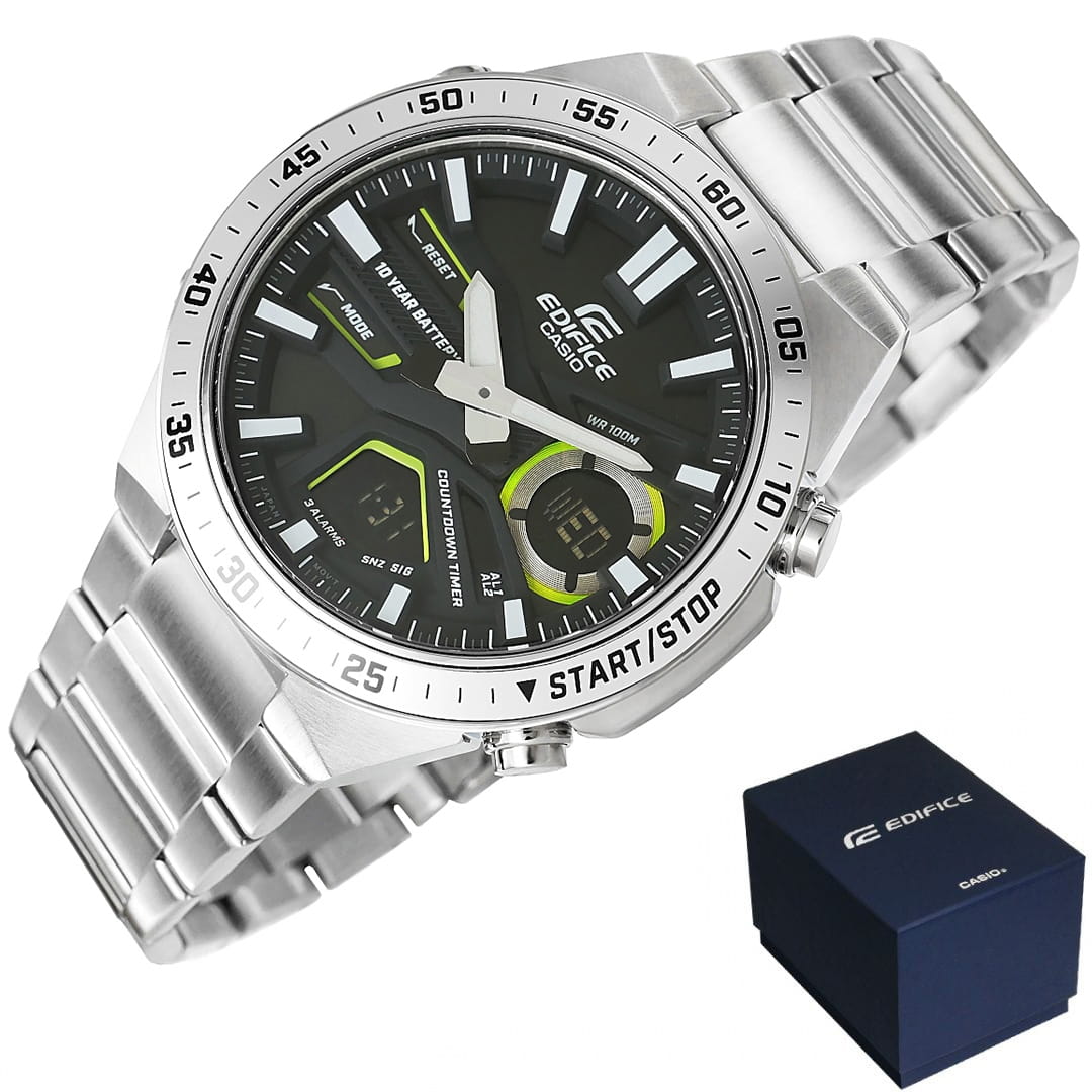 Wszechstronny zegarek dla aktywnych i wymagających. Analogowo-cyfrowy czasomierz EDIFICE EFV-C110 zapewnia precyzję i funkcjonalność na lata – 10-letnia bateria sprawia, że możesz zapomnieć o jej wymianie na długi czas. Dynamiczny, sportowy design podkreśla głębia i trójwymiarowość tarczy, a cyfrowe wyświetlacze oferują szeroki wachlarz funkcji, w tym czas światowy, stoper 1/100 sekundy i minutnik odliczający. Model posiada również Telememo z możliwością zapisania 30 numerów telefonów, zawierających do 12 cyfr z nazwą do 8 znaków. Skup się na życiu i wybierz EDIFICE EFV-C110 - zegarek, który Cię nie zawiedzie.