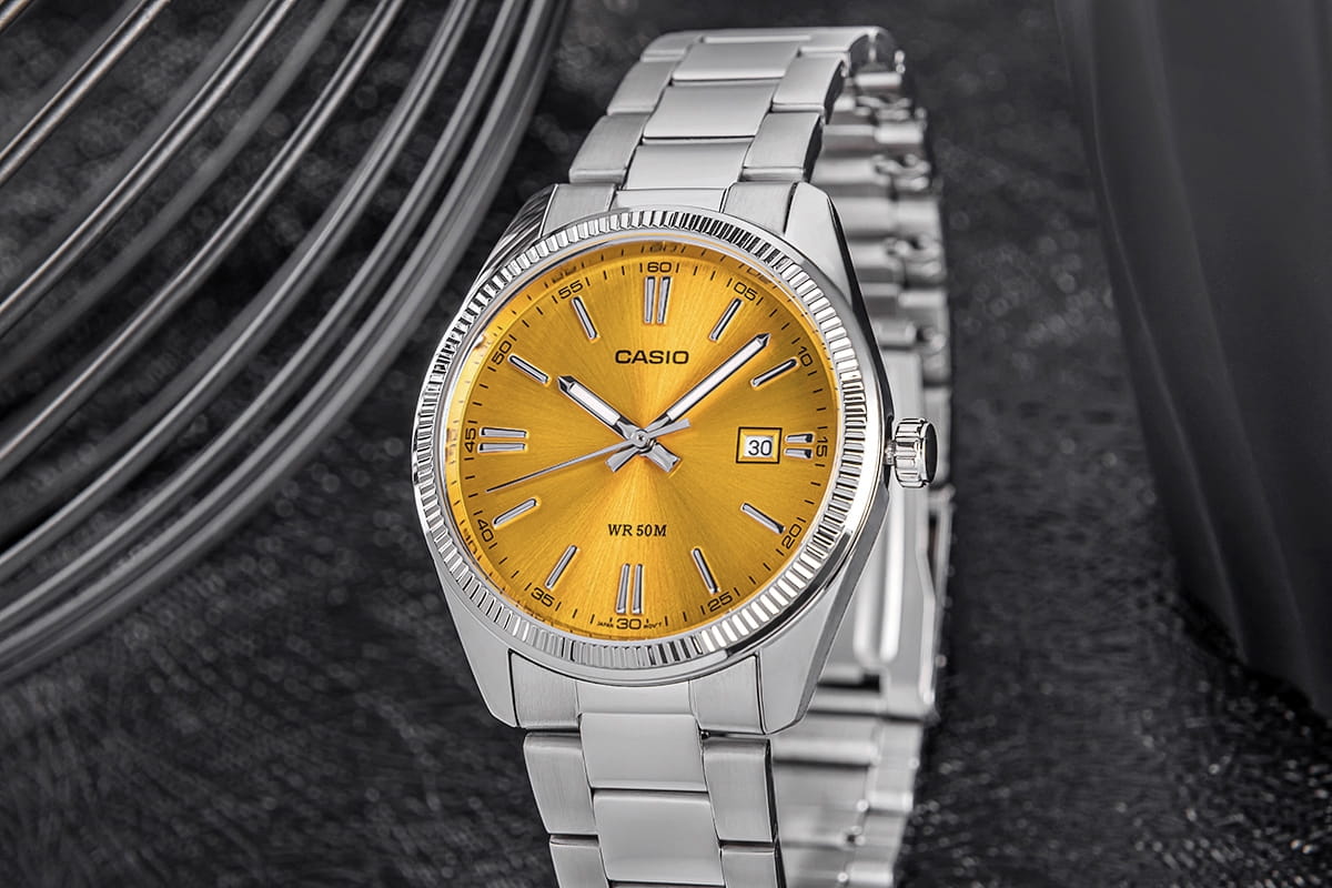 Model należy do kolekcji Casio Classic, która charakteryzuje się eleganckimi, prostymi wzorami stawiającymi na ponadczasowy styl. Srebrna koperta pięknie harmonizuje ze złotą tarczą, tworząc ponadczasowy kontrast idealny zarówno do formalnych, jak i codziennych stylizacji. Delikatny połysk srebrnych indeksów i wskazówek, które dodatkowo wypełniono fluorescencyjną powłoką, zapewnia doskonałą czytelność także w warunkach słabego oświetlenia. Całość dopełnia solidna, srebrna bransoleta wykonana ze stali nierdzewnej, która dodaje zegarkowi elegancji i sprawia, że jest on wygodny w noszeniu. Ten harmonijny dobór kolorów i detali sprawia, że model MTP-1302PD-9AVEF stanowi idealne połączenie klasyki i współczesnego stylu.
