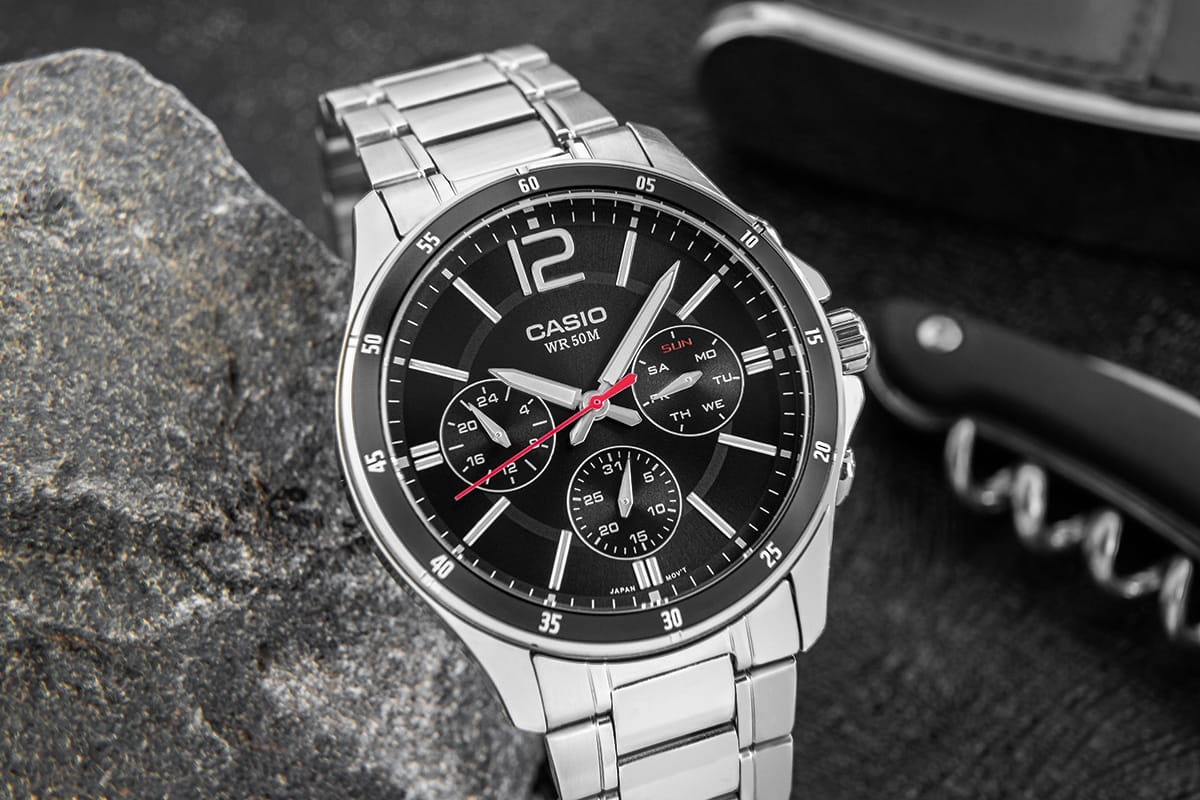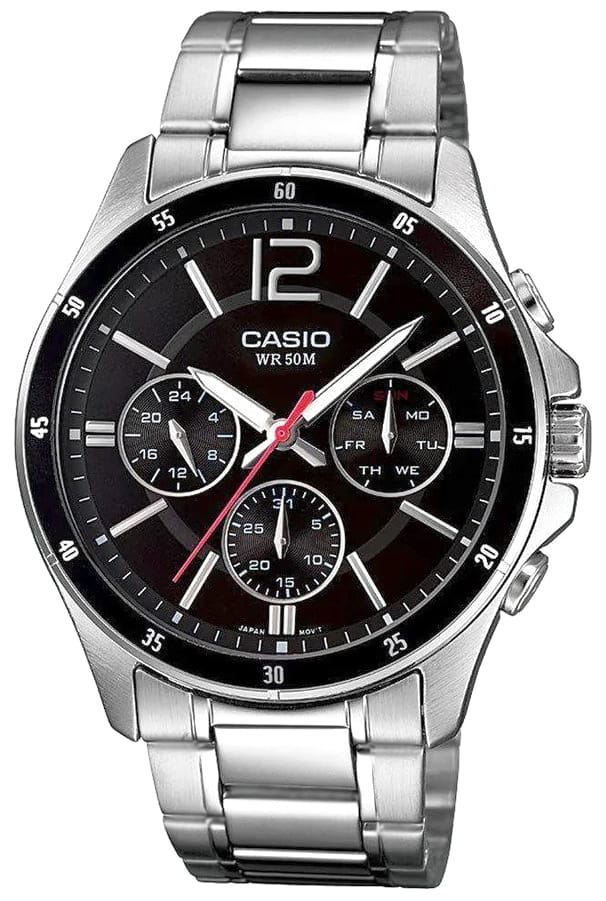 Zegarek męski Casio MTP-1374D-1A wyróżnia się eleganckim i uniwersalnym designem, który doskonale komponuje się zarówno z formalnym, jak i codziennym stylem. Czarna tarcza, ozdobiona delikatnymi srebrnymi i czerwonymi akcentami, tworzy wyjątkowy kontrast z błyszczącą, srebrną kopertą i bransoletą ze stali nierdzewnej. Indeksy godzinowe oraz wskazówki są czytelne, co ułatwia szybkie sprawdzenie czasu, a subtarcze dodają zegarkowi charakteru i funkcjonalności.