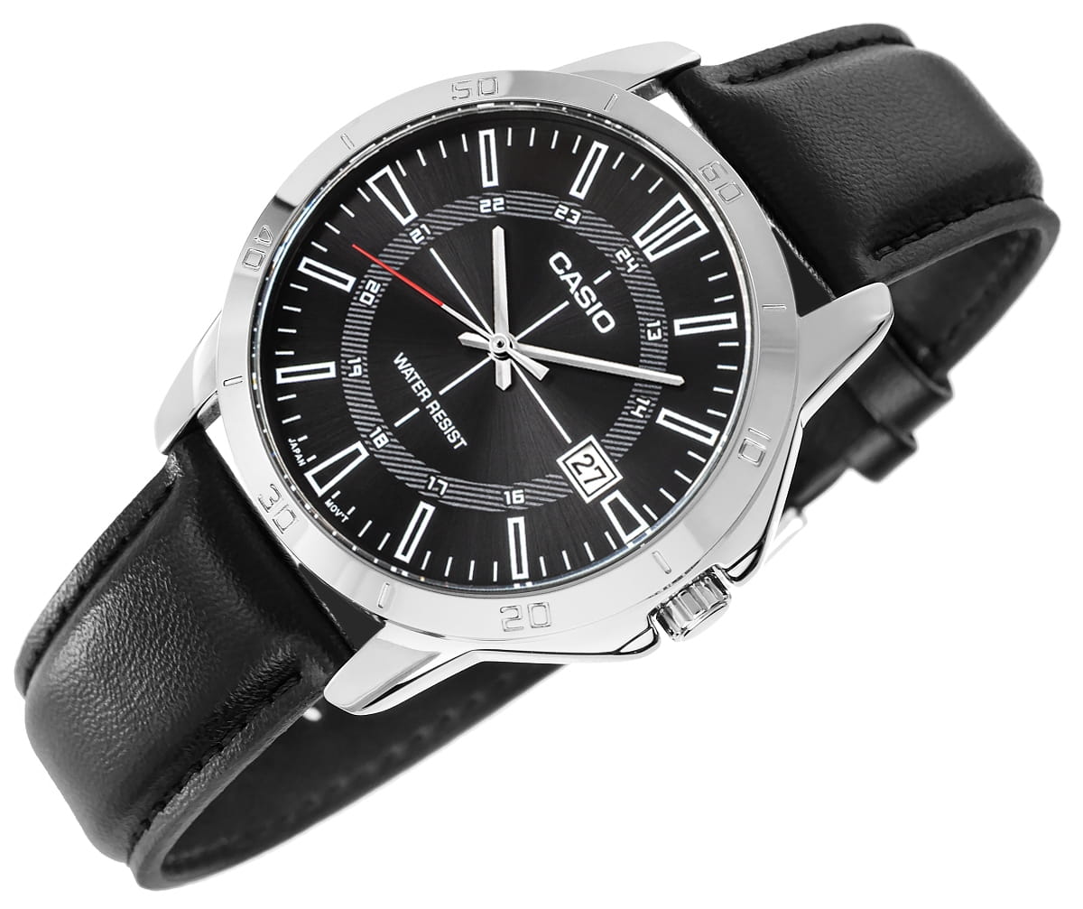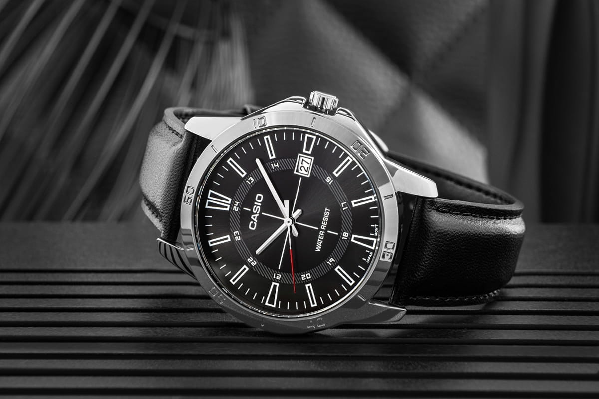 Klasyczny zegarek analogowy CASIO zaprojektowany w oparciu o ponadczasowy wygląd wskazówek godzinowej, minutowej i sekundowej — idealny zarówno na co dzień, jak i na bardziej formalne okazje. Czarne tło uzupełnia koncentryczny wzór z pierścieniem 24-godzinnym oraz czerwona wskazówka sekundowa nadająca całości sportowego akcentu. Smukłe indeksy liniowe oraz praktyczny datownik z dniem tygodnia na godzinie 3 łączą stylowy wygląd z funkcjonalną wygodą. Wodoodporność na potrzeby codziennego użytkowania pozwala czuć się swobodnie podczas mycia rąk czy w deszczową pogodę. Prosty, elegancki akcent, który dopełnia każdy styl.