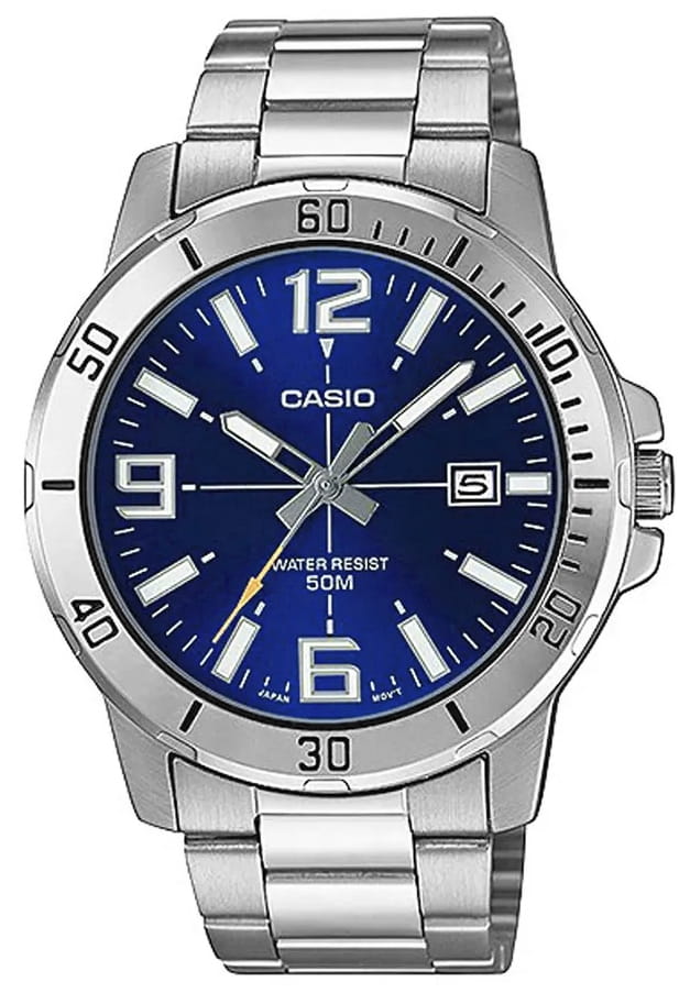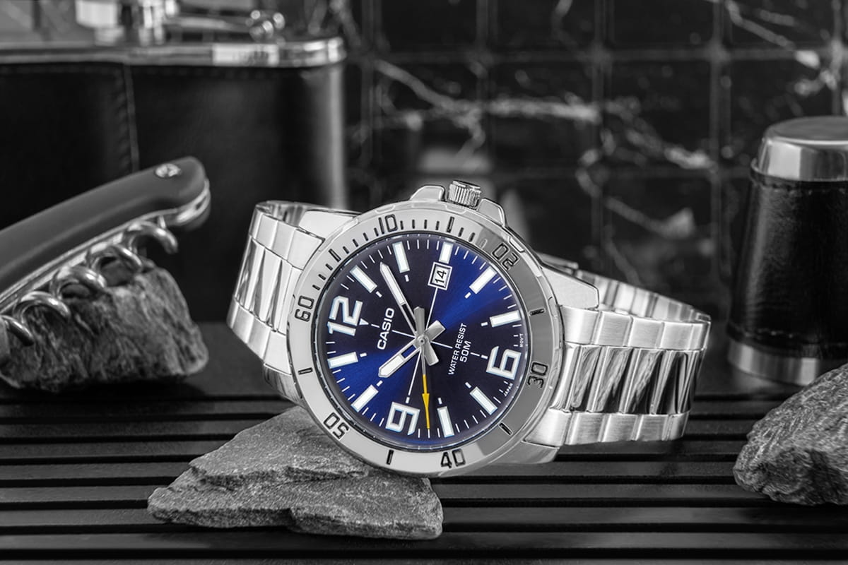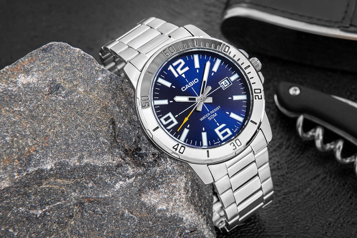 Nie kaĹĽdy zegarek ma to "coĹ›". Casio MTP-VD01D-2BVUDF to model, ktĂłry mĂłwi wiÄ™cej, niĹĽ mogĹ‚oby siÄ™ wydawać. To nie tylko narzÄ™dzie do odmierzania czasu – to manifest stylu, pewnoĹ›ci siebie i mÄ™skiej elegancji. Kiedy zakĹ‚adasz ten zegarek, czujesz chłód stali nierdzewnej, ktĂłra idealnie dopasowuje siÄ™ do nadgarstka. 43 mm koperta – w sam raz, by pokazać charakter, ale nie przesadzić. Niebieska tarcza przyciÄ…ga uwagÄ™, odbija Ĺ›wiatĹ‚o i zmienia odcieĹ„ zaleĹĽnie od kÄ…ta patrzenia – subtelna, ale wyrazista. Do tego duĹĽe indeksy i wskazĂłwki, ktĂłre pozwalajÄ… bĹ‚yskawicznie rzucić okiem na godzinÄ™. To zegarek dla tych, ktĂłrzy lubiÄ… prostÄ…, ale mocnÄ… formÄ™. Zero zbÄ™dnych dodatkĂłw – tylko to, co najwaĹĽniejsze.Â