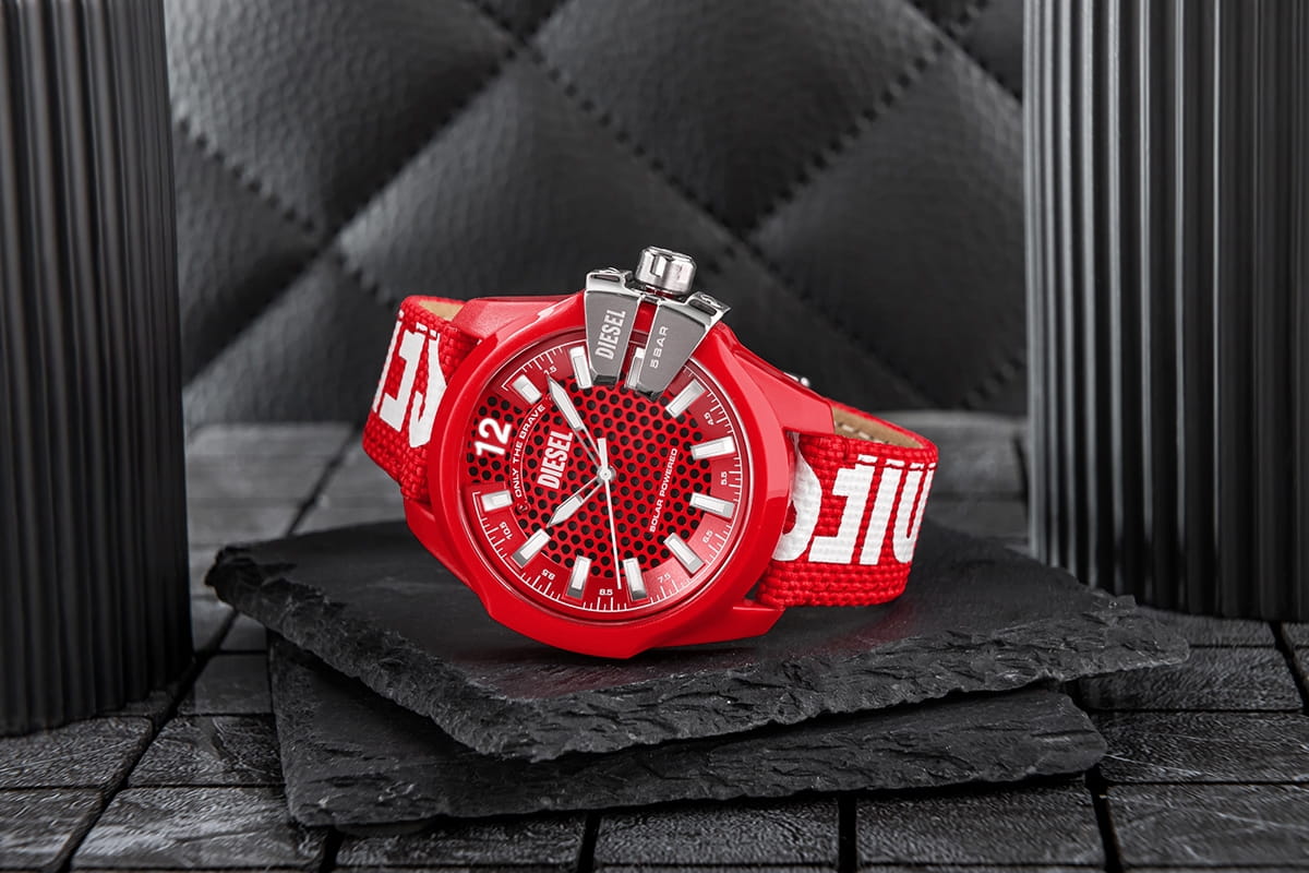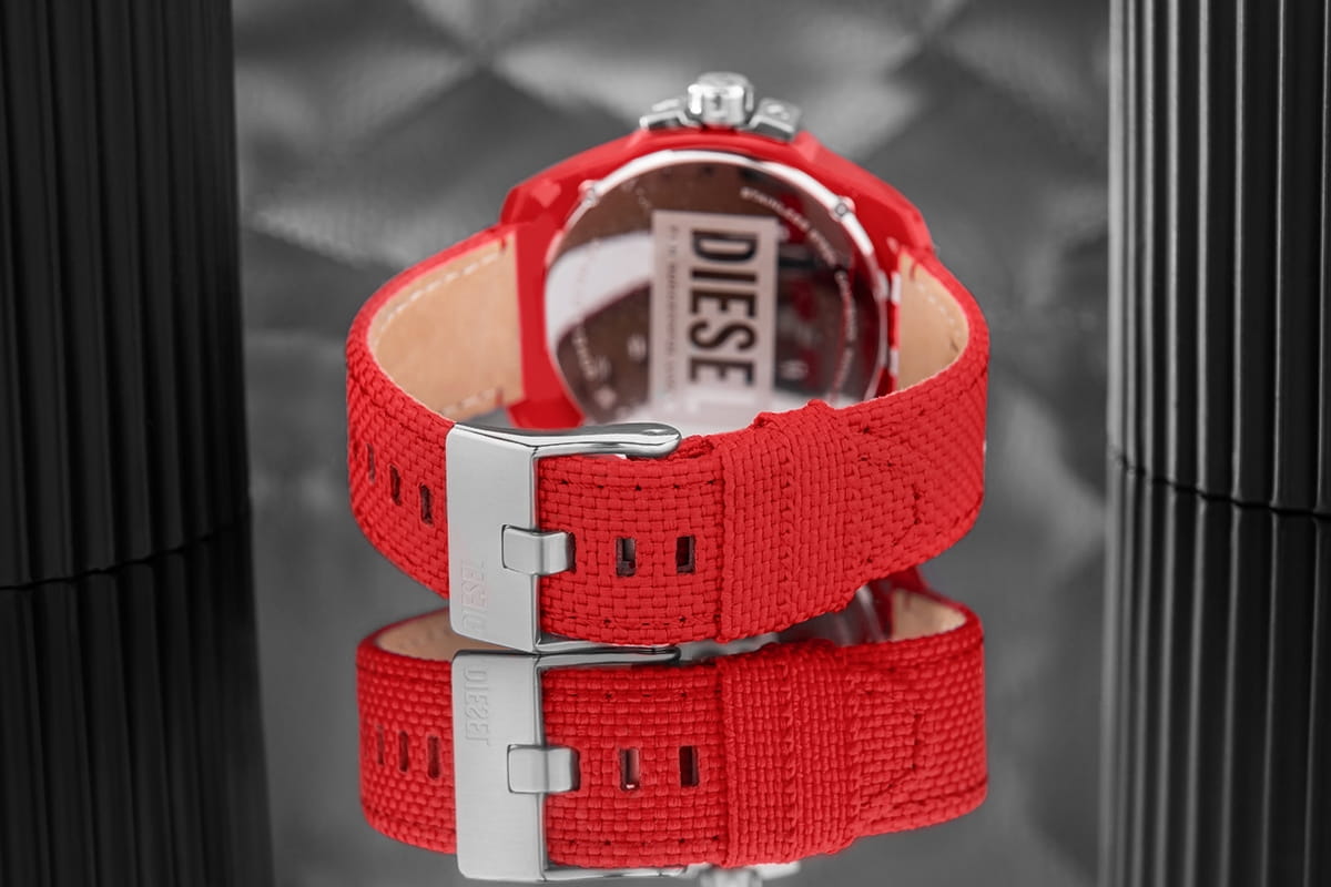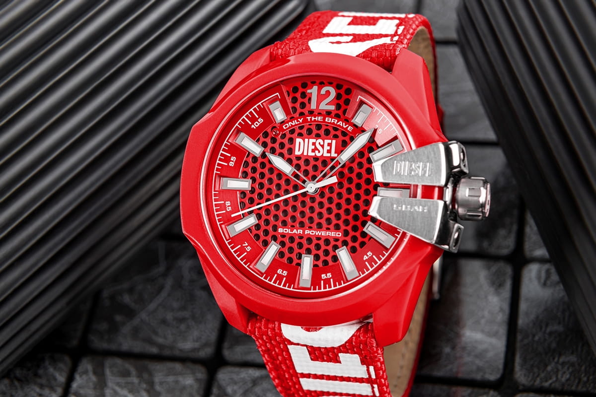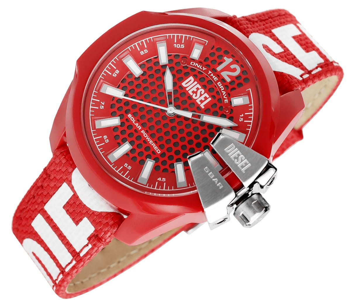 Wyrazisty i nowoczesny czasomierz wyposażony w mechanizm solarny, który czerpie energię ze światła, eliminując potrzebę wymiany baterii. Intensywna czerwień koperty i paska, uzupełnionego białymi detalami nadaje mu sportowy i dynamiczny wygląd. Unikalna perforowana tarcza w czarno-czerwonym motywie z wyraźnymi indeksami i cyfrą 12 zapewnia czytelność. Pasek wykonany z wytrzymałego materiału tekstylnego z dużym, kontrastowym logo DIESEL podkreśla streetwearowy styl zegarka.