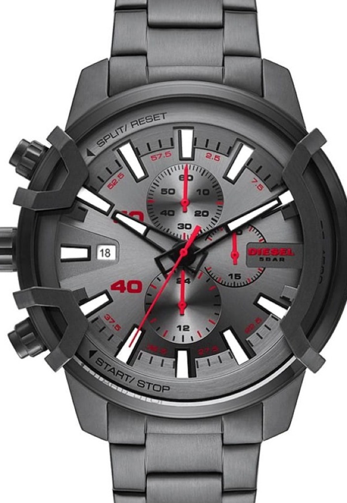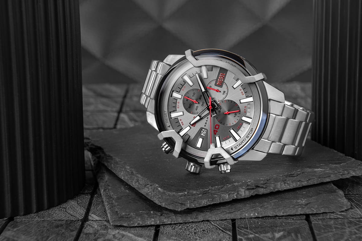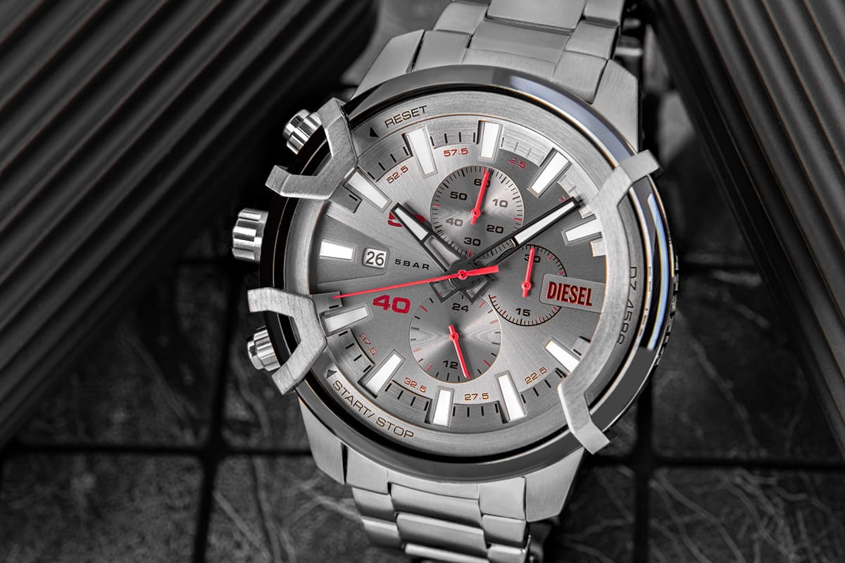 Srebrzystoszary odcień z delikatnym, szczotkowanym wykończeniem tworzy bazę, która wydobywa moc detali. Wyraziste, czerwone akcenty na wskazówkach i subtarczach wnoszą dynamikę i energię, jakby zegarek był gotowy na każdą akcję. Wysokie indeksy i elementy wystające z powierzchni tarczy nadają jej trójwymiarowego charakteru, podkreślając solidność i głębię projektu. Dzięki powłoce luminescencyjnej na wskazówkach i indeksach odczyt czasu jest możliwy nawet w słabym świetle, co zwiększa praktyczność modelu. Maszynowy napis DIESEL wygrawerowany z boku koperty to detal, który mówi wiele o charakterze tego modelu – surowy, bezkompromisowy, gotowy sprostać oczekiwaniom najbardziej wymagających mężczyzn.