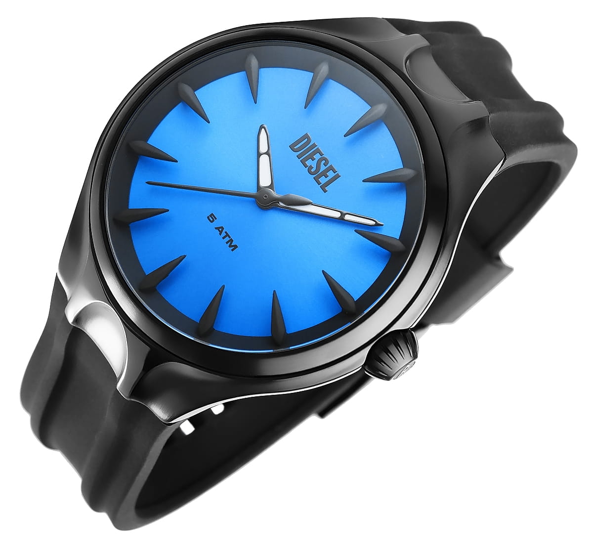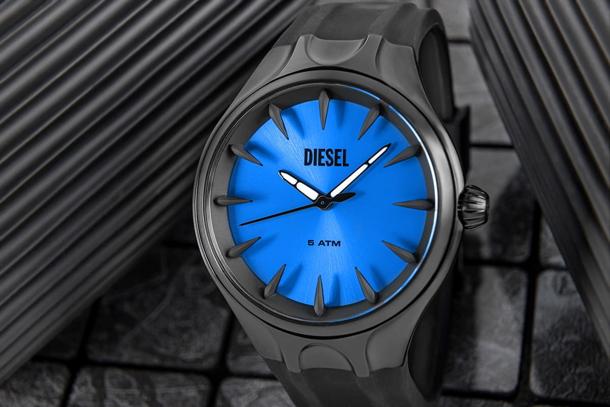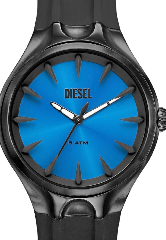 Diesel DZ2203 to zegarek, który łączy futurystyczny design z efektowną głębią kolorów. Hipnotyzująca, niebieska tarcza o promienistym szlifie odbija światło pod różnymi kątami, tworząc spektakularny efekt zmieniających się odcieni – od chłodnego błękitu po intensywny kobalt. Na pierwszy plan wysuwają się trójwymiarowe, ostro zakończone indeksy, które zdają się wyrastać z tarczy, tworząc efekt 3D. Ich geometryczna, niemal kolczasta forma dodaje zegarkowi surowej, industrialnej wyrazistości, podkreślając jego unikalny charakter. Dzięki temu każdy rzut oka na tarczę to nie tylko odczyt czasu, ale również gra świateł i cieni, która przyciąga uwagę i dodaje zegarkowi niezwykłej głębi.