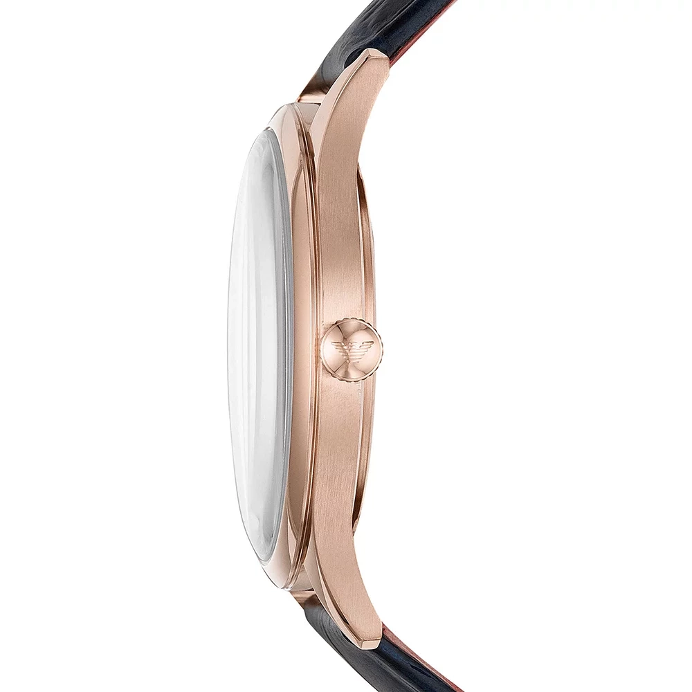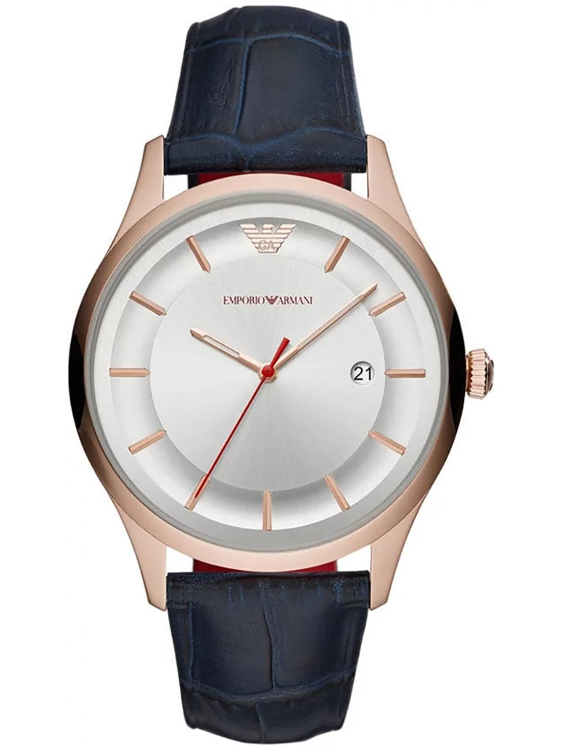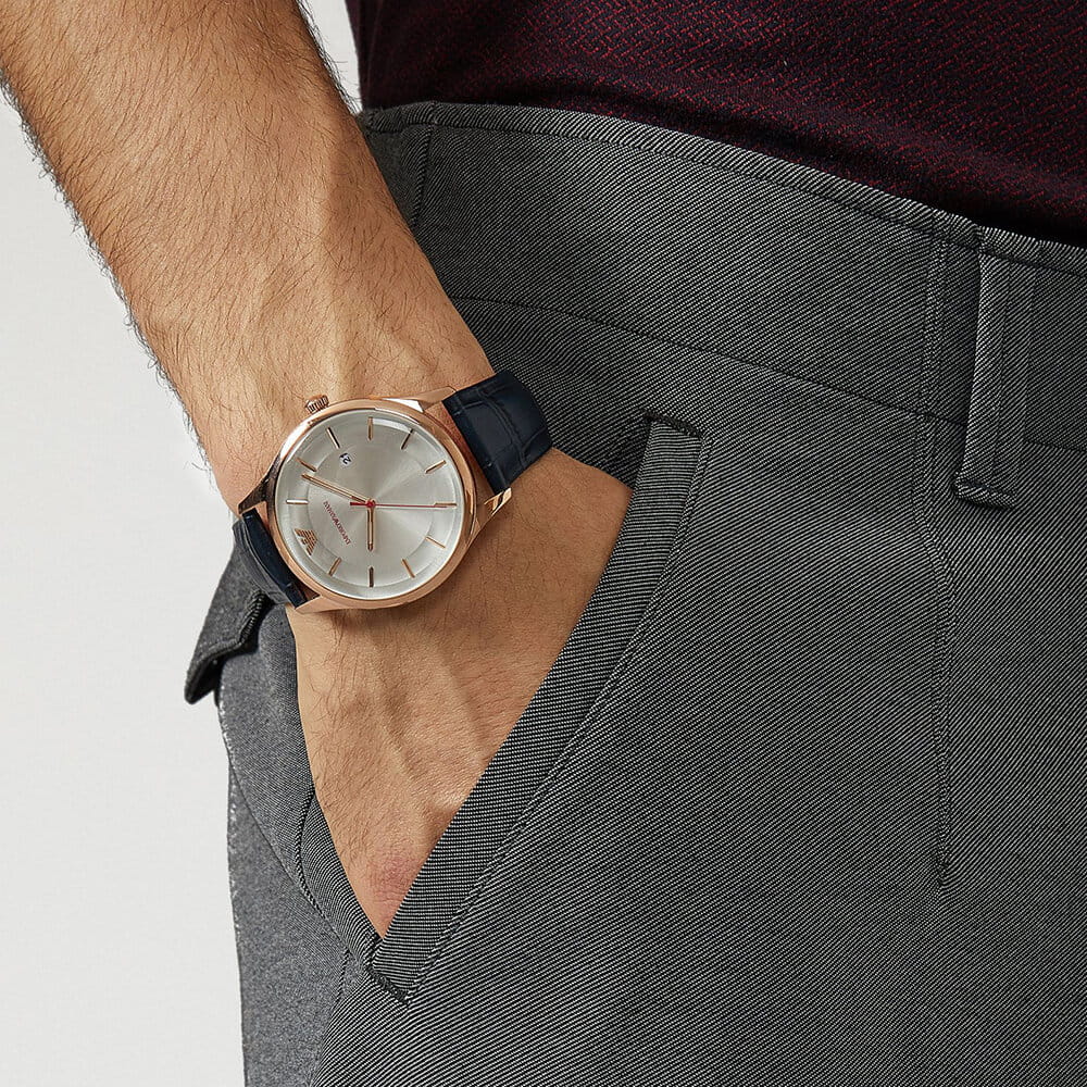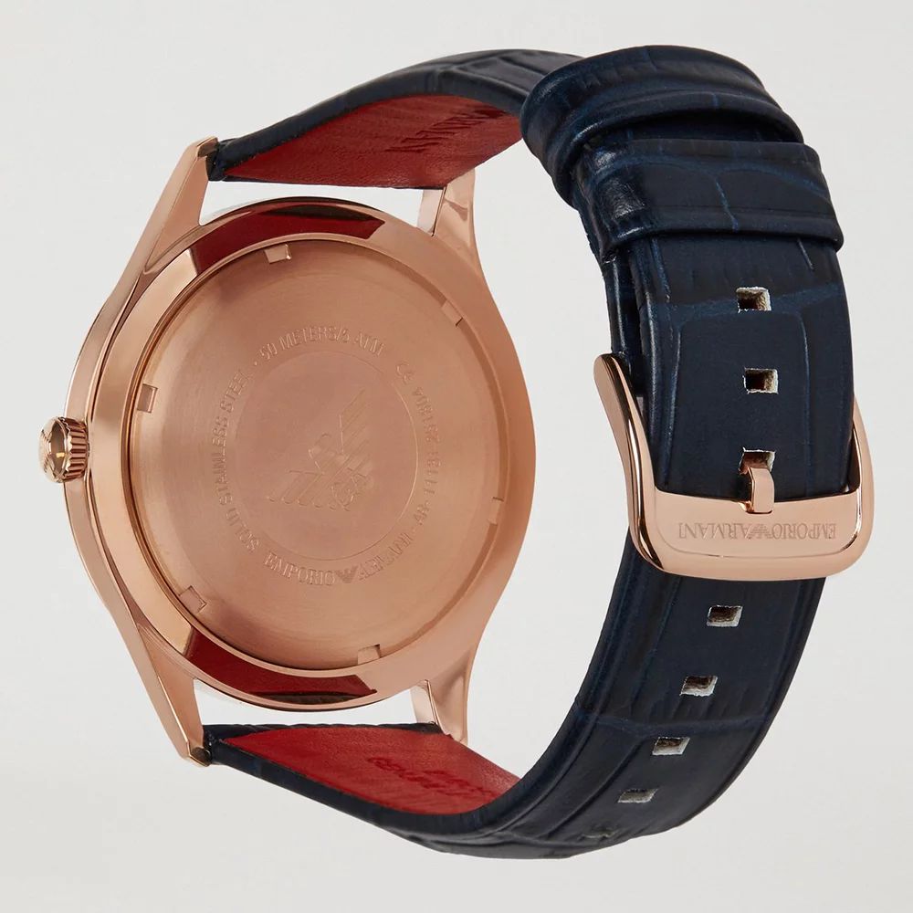 Zegarek męski marki Emporio Armani Lambada AR11131 to połączenie luksusu i stylu, której nie można przeoczyć. Jego koperta w kolorze różowego złota emanuje subtelnością i wyrafinowaniem, nadając całości elegancki charakter. Zegarek ten posiada skórzany pasek w intensywnym niebieskim odcieniu, co dodaje mu niepowtarzalnego uroku. Co jednak czyni go naprawdę wyjątkowym, to nietypowe podejście do detali - od spodu paska widoczny jest czerwony kolor, co nadaje zegarkowi charakterystyczny, unikalny akcent.Beżowa tarcza z delikatnym, złotym logo marki Emporio Armani doskonale komponuje się z pozostałymi elementami, tworząc harmonijną całość. Zegarek Lambada AR11131 nie tylko wyróżnia się estetyką, ale także jest praktycznym dodatkiem do codziennego stylu życia, oferując wodoodporność WR50, co oznacza, że jest odporny na zachlapania i krótkotrwałe zanurzenia.To nie tylko zegarek, to wyraz osobistego stylu i gustu. Jego ponadczasowy design sprawia, że doskonale sprawdzi się zarówno w eleganckich okolicznościach, jak i w codziennym użytkowaniu, dodając każdej chwili odrobinę luksusu. Emporio Armani Lambada AR11131 to nie tylko zegarek, to wyjątkowy akcent, który podkreśla indywidualność noszącego.