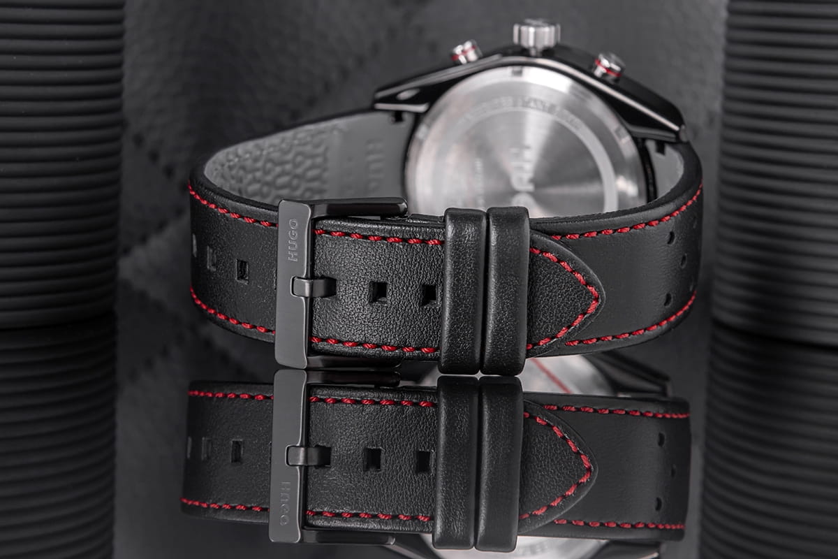 Główna tarcza w kolorze głębokiej czerni została podkreślona odważnymi, czerwonymi akcentami, które emanują energią i pasją. Przejrzyste sub-tarcze chronografu oraz tachymetr umieszczony na pierścieniu dodają funkcjonalności i dynamiki. To zegarek, który jest gotowy na każde wyzwanie €“ od codziennych obowiązków po aktywności sportowe. Solidna, stalowa koperta w połączeniu z eleganckim, perforowanym skórzanym paskiem nadaje całości nowoczesny charakter. Czerwone przeszycia na pasku to subtelny, ale wyrazisty detal, który idealnie wpisuje się w dynamiczną stylistykę tego modelu.