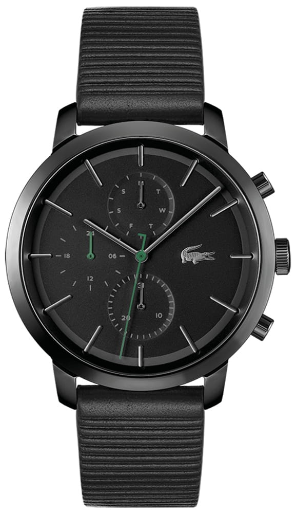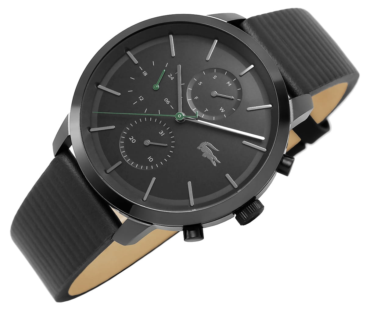 Całość utrzymana jest w głębokiej, matowej czerni, co nadaje mu wyrazistego, mocnego wyglądu. Zegarek wyróżniają subtelne zielone akcenty na wskazówkach, które dodają mu odrobinę dynamiki i nawiązują do klasycznego logo Lacoste. Wykonany z solidnych materiałów, zegarek posiada kopertę ze stali nierdzewnej, która zapewnia trwałość i elegancki wygląd. Jego czarny, teksturowany pasek ze skóry naturalnej idealnie wpisuje się w sportowy, a jednocześnie stylowy charakter tego modelu, zapewniając komfort noszenia przez cały dzień. Czarne logo Lacoste dumnie umieszczone na cyferblacie i sprzączce to znak prestiżu, który kojarzy się z ponadczasową jakością.
