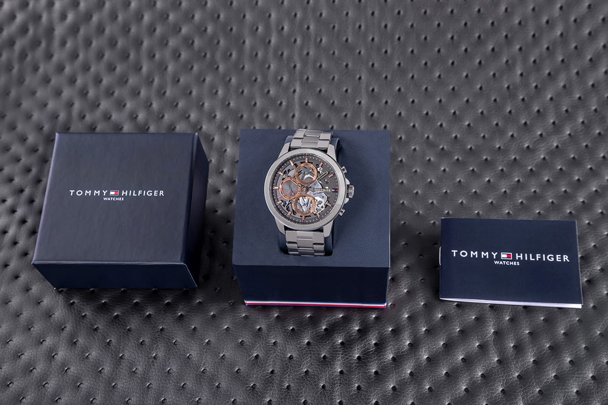 Z zegarkiem otrzymasz stylowe, firmowe pudełko w kolorystyce marki Tommy Hilfiger. To eleganckie opakowanie stanowi idealne uzupełnienie, które sprawia, że zegarek staje się gotowym, luksusowym prezentem. To subtelny akcent, który podkreśla wyjątkowy charakter i klasę marki Tommy Hilfiger.
