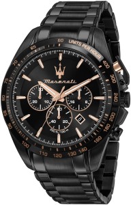 Maserati R8873612048 z kolekcji Traguardo to nowoczesny zegarek męski inspirowany sportową motoryzacją i włoskim designem. Model wyróżnia się efektowną, czarną kolorystyką koperty i bransolety, którą przełamują luksusowe detale w odcieniu różowego złota. To zestawienie nadaje mu dynamiczny, a zarazem niezwykle prestiżowy charakter.